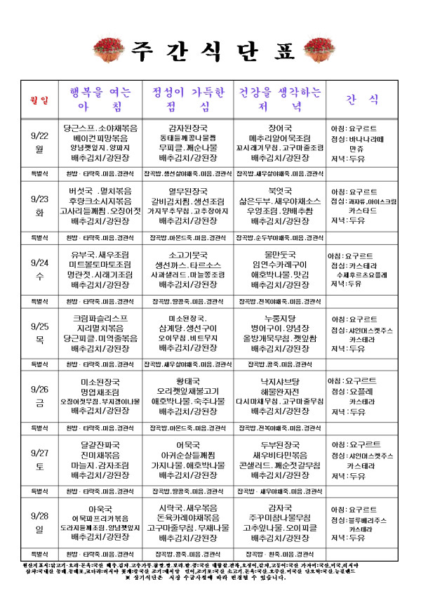 주간식단표 9월 22 - 9월 28일까지입니다.