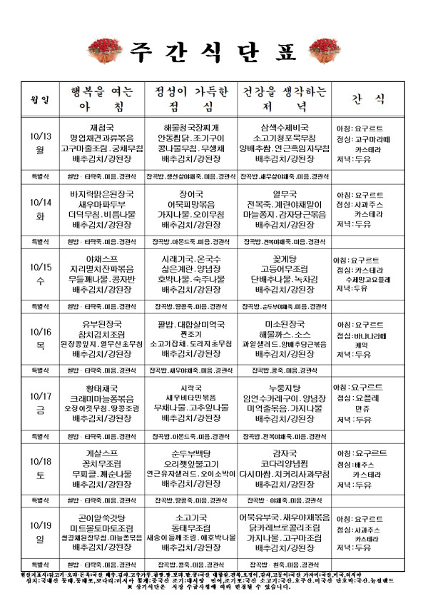 주간식단표 10 월 13일 - 10월 19일까지입니다.