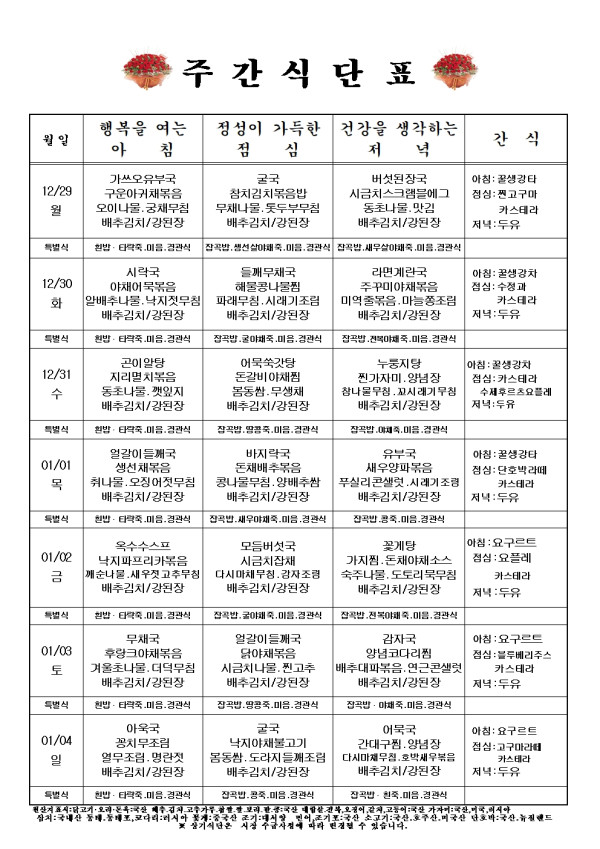 주간식단표 입니다. 12월 29 일 - 2026년 1월 04일까지입니다.