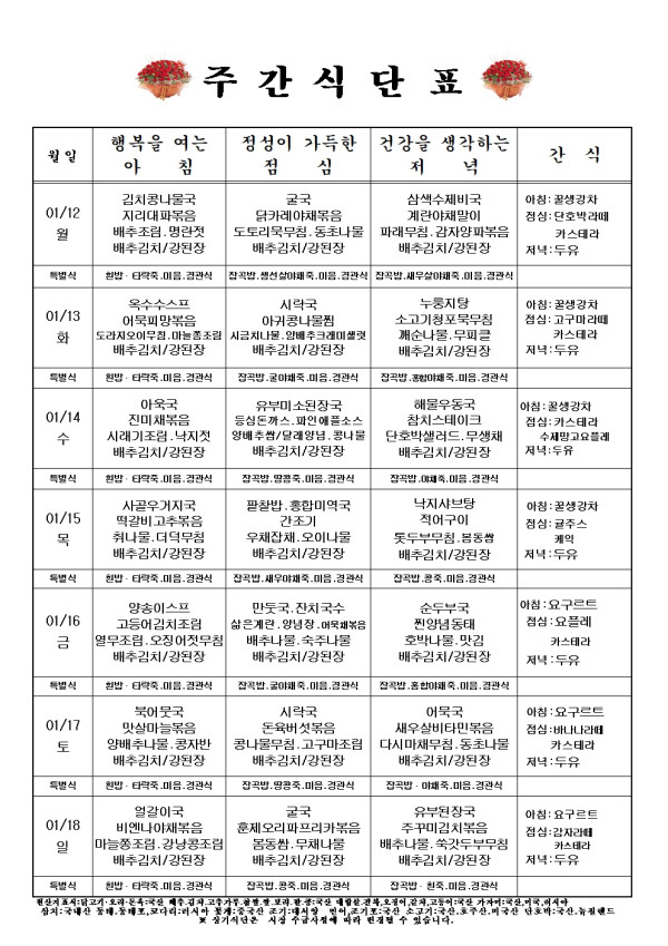 - 다음글주간식단표 1 월 5일 - 1월 11일까지입니다. 26.01.09