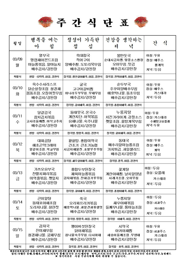 주간식단표 3월 9일 - 3월 15일까지입니다. 작성자 영양사 조회수 : 25회 작성일 26-03-12 본문 주간식단표 3/9일 - 3/15일까지입니다 목록 다음글주간식단표 3월 02일 - 3월 08일까지입니다. 26.03.05