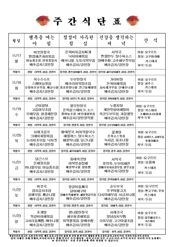 주간식단표 11월 17일 - 11월 23일까지입니다.