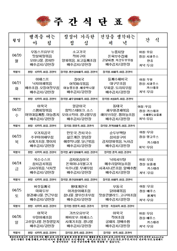 주간 식단표입니다.( 4/20 - 4/26)일까지입니다.