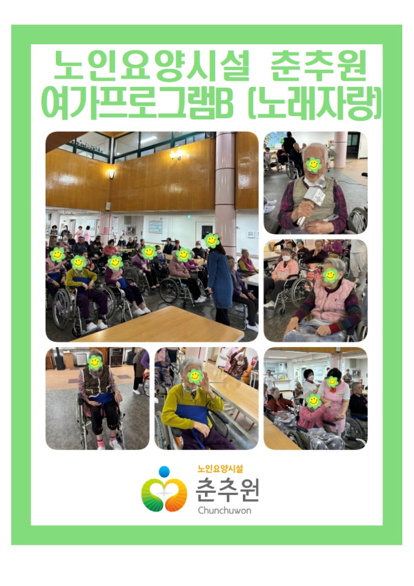 여가B 노래자랑 프로그램을 통해 어르신들께서 익숙한 노래를 부르며 즐겁게 참여하셨으며 노래 가사와 멜로디를 따라 부르는 과정에서 정서적 안정감과 성취감을 느끼는 모습 보이셨다. 순서를 기다리며 다른 어르신의 노래를 감상하는 등 사회적 상호작용이 자연스럽게 이루어지며 공동체 분위기가 형성되며 일부 어르신은 박수와 호응으로 적극적인 반응을 보이셨고, 발성 및 호흡 사용을 통해 잔존 기능 유지에도 도움이 되는 전반적으로 프로그램 참여도가 양호하였으며, 즐거운 여가 경험을 통해 활기와 만족감을 제공하는 데 긍정적인 시간이었습니다.