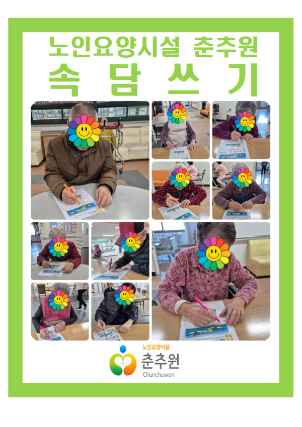 어르신들과 '고래싸움에 새우 등 터진다.', 새우로 잉어를 잡는다.'라는 속담을 쓰고 이름도 적어보는 시간을 가졌습니다.