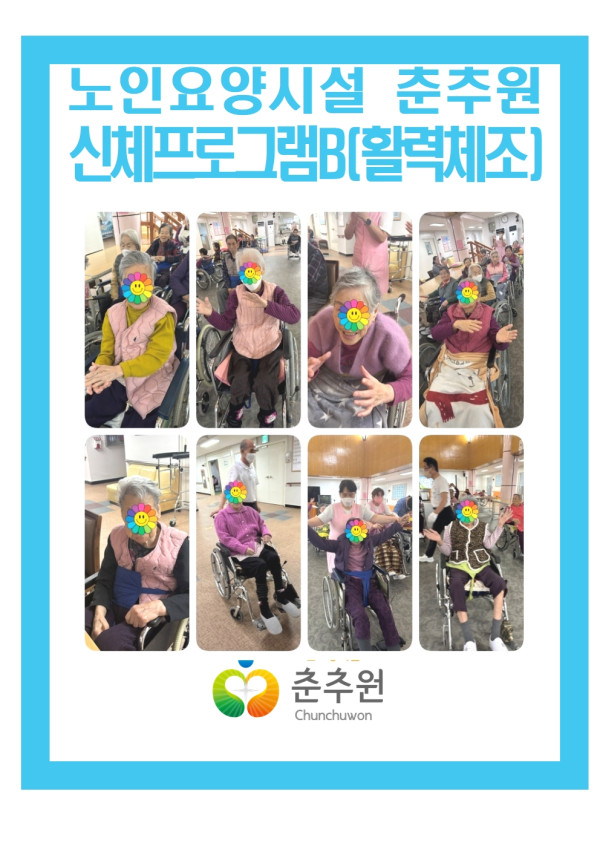 활력체조 신체B 프로그램은 어르신들의 잔존 신체기능을 유지·강화하고 활력을 증진시키는 데 중점을 두어 진행되었으며, 전반적으로 참여도는 보통 수준을 보였고 일부 어르신은 동작 수행 시 속도와 범위에 제한이 있었으나 반복 동작과 구두 안내를 통해 점차 적응하는 모습을 보이셨습니다.