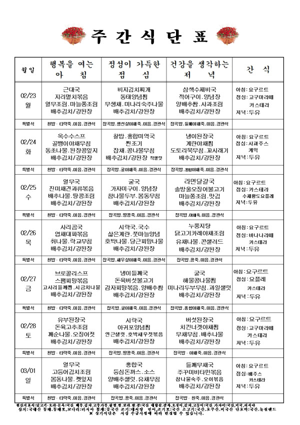 주간식단표 2월 23일 - 3월01일까지입니다.