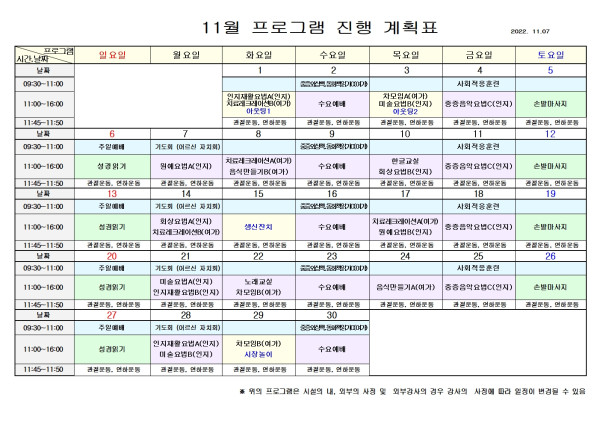 11월 프로그램 진행 계획표 (수정) 작성자 사회복지사2 조회수 : 5,902회 작성일 22-11-07 본문 목록 이전글주간 식단표 11월07일 - 11월 13일까지입니다. 22.11.09 다음글주간식단표 10월31 - 11월 06일까지입니다. 22.11.04