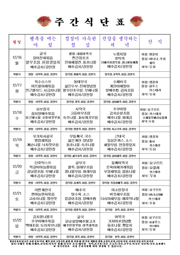 주간식단표 12월 16일 - 12월 22일까지입니다.