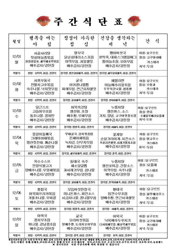 주간식단표 12월 01일 - 12월 07일까지입니다.