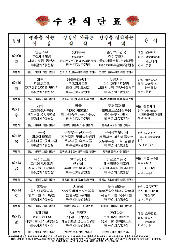 주간식단표 2월 9일 - 2월 15일까지입니다. 작성자 영양사 조회수 : 10회 작성일 26-02-14 본문 주간식단표 2/9일 - 2/15일까지입니다. 목록 다음글주간식단표 2월 02일 - 2월 08일까지입니다. 26.02.05