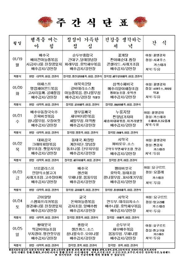 주간식단표 1월 19일 - 1월 25일까지입니다.