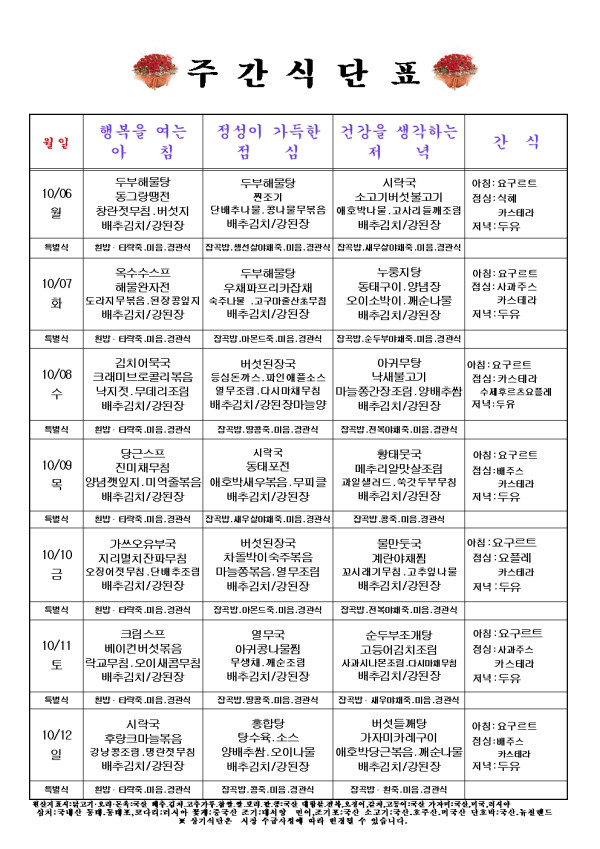주간식단표 10월 06일 - 10월 12일까지입니다.
