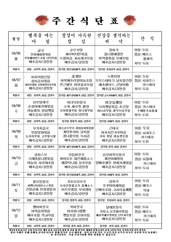 주간식단표 4월 06일 - 4월 12 일까지입니다.