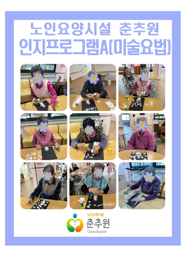 검정색 색지 위에 솜을 활용하여 눈을 표현해보는 미술요법 A 프로그램은 강한 색 대비와 부드러운 촉감 자극을 통해 참여자의 감각적 집중을 높이고, 눈이라는 상징적 표현을 매개로 내면의 감정과 생각을 자연스럽게 드러낼 수 있도록 도와 정서적 안정과 자기표현 능력 향상에 긍정적인 효과를 보인 활동 이었습니다.
