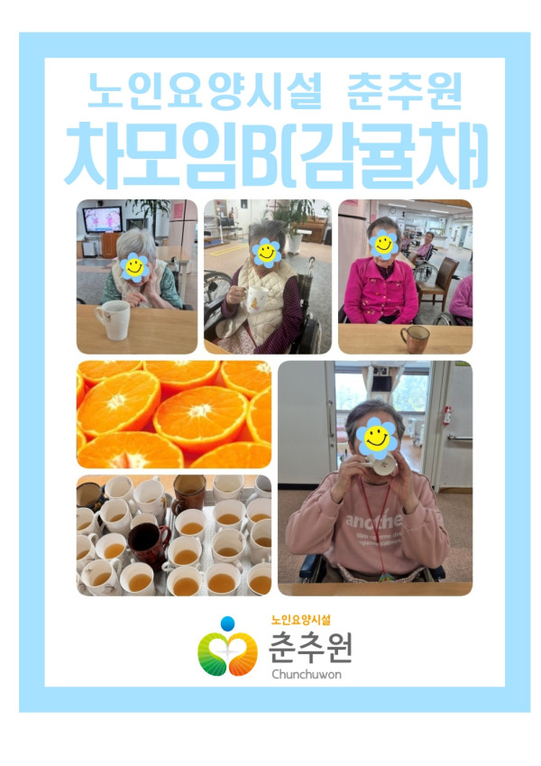 차모임 여가 B 프로그램에 참여한 어르신께서는 따뜻한 감귤차 제공을 통해 신체적 이완과 정서적 안정이 유도되었으며, 차 향과 온기에 자연스럽게 집중하는 모습이 관찰되었으며 말로 표현하는 반응은 제한적이었으나, 고개 끄덕임·시선 이동·컵 잡기 등의 비언어적 반응을 통해 프로그램에 지속적으로 참여하는 시간 이었습니다.