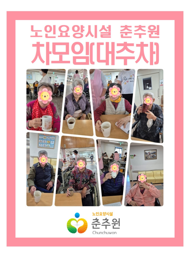 어르신들과 함께 여가 차모임(대추차) 프로그램을 통해서 정서적 안정 제공, 상호 교류 증진, 따뜻한 음료를 통한 심신 이완이 되는 시간을 가졌습니다.