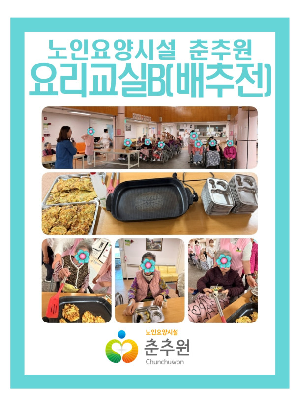 여가 B그룹 배추전 만들기 프로그램은 어르신들이 손으로 직접 재료를 만지고 냄새를 맡으며 오감을 활용할 수 있도록 돕는 활동으로 진행 되었으며 배추를 씻고 밀가루 옷을 입히는 간단한 과정 중심으로 안내하고 어르신들의 인지 수준을 고려해 단계마다 시범을 보이고 반복 설명을 제공함. 대부분의 어르신들이 동작을 바로 이해하지는 못했으나, 천천히 따라 하시려는 모습을 보이며 참여 의지를 나타내심. 조리 과정에서 일부는 혼돈을 보였으나 옆에서 손을 잡아 드리며 안내하자 안정적으로 참여하셨음. 지시에 대한 반응은 느리나, 재료를 만지며 촉감에 흥미를 보이기도 하셨습니다.